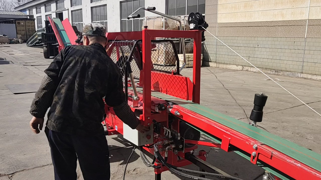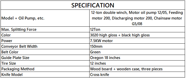 Our wood processor is a high-efficiency solution for wood processing. It has a 12-ton double winch and a power system with motor oil pump 12/05, feeding motor 200, discharging motor 200, and chainsaw motor G5/08. Powered by a 7.5KW motor, it features a 150mm - wide green conveyor belt for smooth wood transport. With an 18 - inch Oregon guide plate, 12 - inch tires, and cross knives for precise cutting, it ensures stable and effective operation. Packaged in wood boards + wooden cases (three pieces), it's ideal for logging and woodworking industries.