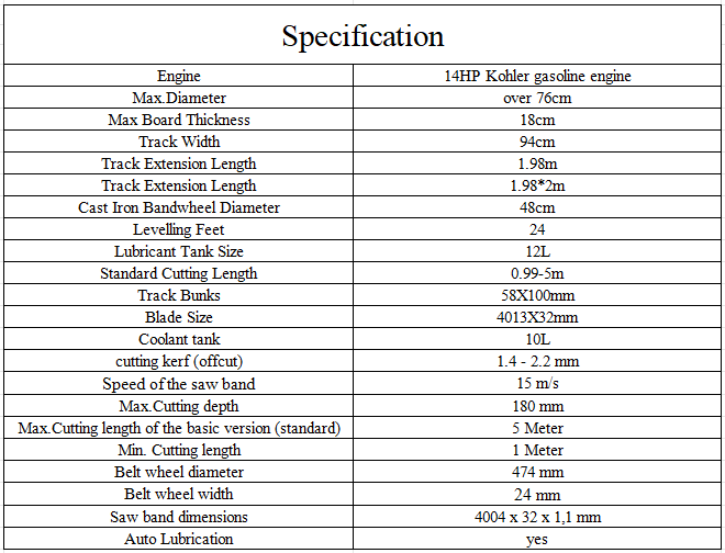 This high-performance band sawmill is engineered for efficient, large-scale wood processing, powered by a robust 14HP Kohler gasoline engine that delivers reliable, consistent power for demanding cutting tasks.Its impressive capabilities include handling logs with max diameter over 76cmand boards up to 18cm thick, paired with a 94cm track width and extendable track length (1.98m, or up to 3.96m with dual extensions) to accommodate workpieces ranging from 1m to 5m in length (standard cutting length: 0.99-5m). The 48cm cast iron bandwheel and 4013×32mm blade(paired with a 4004×32×1.1mm saw band) operate at a smooth 15m/s saw band speed, achieving a precise 1.4-2.2mm cutting kerf and a deep 180mm max cutting depthfor clean, accurate results.Practical design features enhance usability: 24 levelling feet ensure stable setup on uneven ground; a 12L lubricant tank (with auto-lubrication) and 10L coolant tank support prolonged operation; and 58×100mm track bunks secure workpieces during cutting. The electric cutting height adjustment adds convenience, while the durable 474mm diameter × 24mm width belt wheel ensures long-term performance.Ideal for sawmills, lumber yards, or large-scale woodworking projects, this sawmill combines power, precision, and durability to handle heavy workloads with ease.