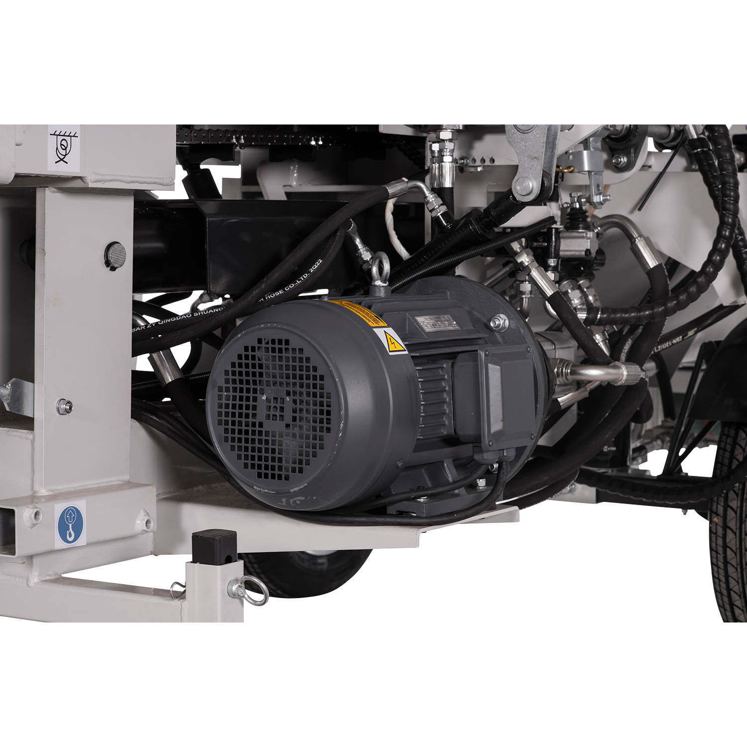 With this hydraulic electric wood processor, even producing large quantities of firewood becomes child's play. The 2+1 control valve set ensures simple and easy operation. Automatic chain lubrication and the processing of logs by sawing and splitting in a single pass make working with this machine particularly efficient. The chainsaw is equipped with a good saw chain, known for its high quality and durability. With a processing capacity of 5-8 m³ of wood per hour, work is completed quickly. The automatic material removal via belt conveyor further simplifies the process. The powerful 9.5 kW electric motor enables rapid work, even with larger logs up to 50 cm in diameter. The hydraulic chainsaw and log holder controls ensure fast and easy operation. An integrated hydraulic feed chain supplies the log splitter with material. The set includes a control valve set, a pump, and a hydraulic motor.