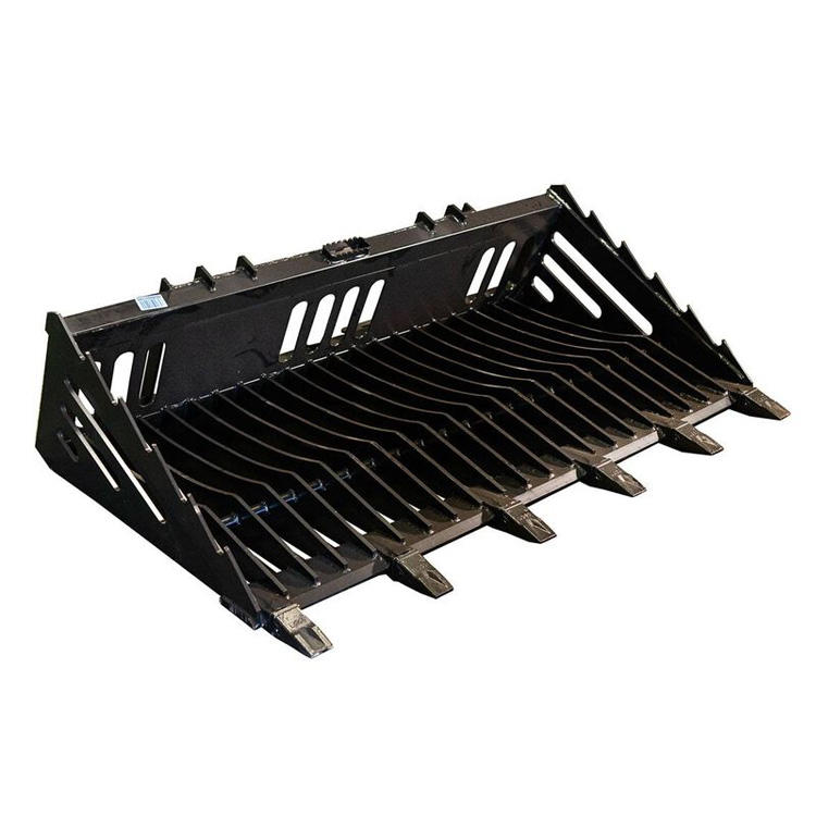 We have two products of 60 inches and 72 inches. You can choose products with different widths according to your actual situation. Both products are added with Skid Steer quick tach to ensure quick connection with most common skid steer loaders and tractor loaders, saving time and effort for installation. The 4-inch tine spacing can ensure the loading of rocks, while its open bottom end can also loosen soil and screen dirt, debris, etc. You don't have to worry about the service life of the teeth, because the teeth can be replaced, so you can use it with confidence. In addition, we spray a durable powder-coated finish on the surface of the product to ensure its long-term beauty.